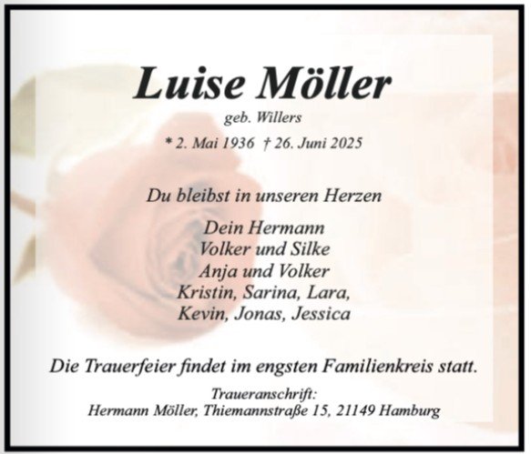 mit tiefem Mitgefühl habe ich vom Tod von Tante Luise erfahren. Es ist schwer, die richtigen Worte zu finden, wenn ein so besonderer Mensch geht.